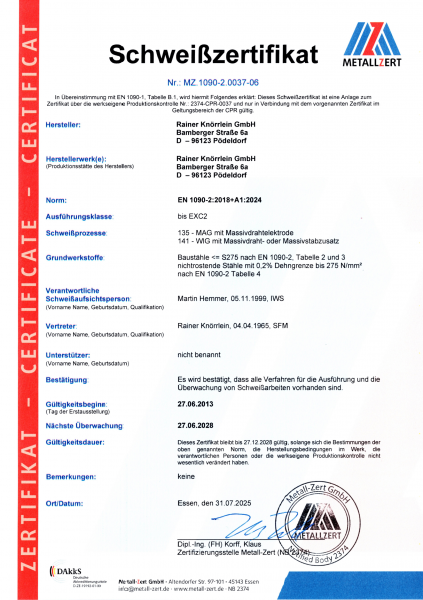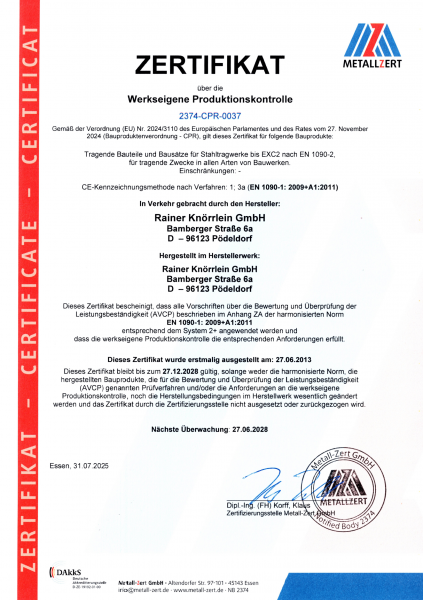 Unser Betrieb ist seit 2013 für „tragende Bauteile und Bausätze für Stahltragwerke bis EXC2“ nach DIN EN 1090-2 zertifiziert und somit berechtigt, für unsere Produkte ein CE-Zertifikat auszustellen.